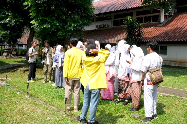 Kelompok anak-anak muda tersebut adalah, dua puluh orang di antaranya, murid-murid SMA dan yang setara. Berasal dari kelas 10, 11, dan 12. Sisanya, yang berjaket kuning, adalah para mahasiswa Departemen Arkeologi FIB UI. Sesekali, terdengar tawa berderai di antara mereka. Sedang ngapain sih mereka itu sebetulnya? Koq terlihat menyenangkan sekali suasana di antara mereka?